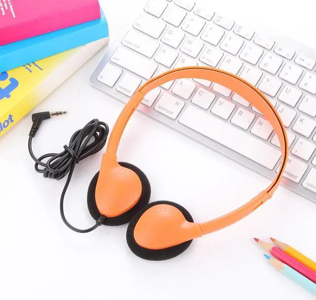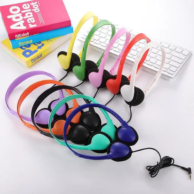 Bulk headphones for classroom with a 3.5 mm jack that kids can plug into Chromebook computer laptop.