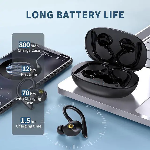 [70Hrs Battery Life with Charging Case & Type-C Fast Charge] Built in 800mAh charging case. The both earbuds can last for 12hours music time on a single 1.5hours charge. The charge case can charge the tws earbuds for 5-6 times.