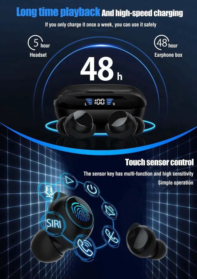 ULTRA LONG TIME BATTERY & LED POWER DISPLAY - Wireless earbuds can last 5 hours of listening to songs, and the charging case can extend the usage time up to 48 hours, which means the charging case can provide 10 extra charge power for earbuds.