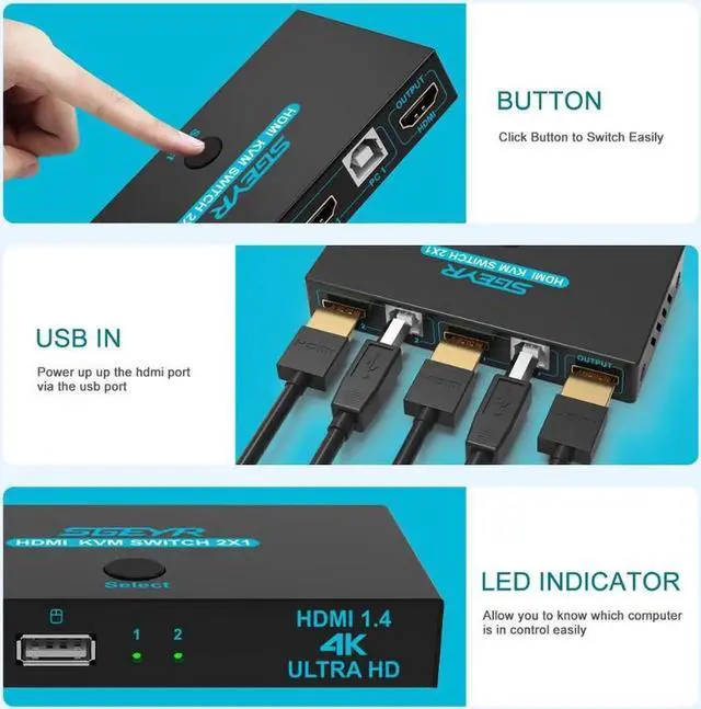 • Aomoproing SGEYR 2x1 HDMI KVM Switch 4K 2 Port USB KVM Switch 2 PC 1 Monitor KVM Switch Keyboard Mouse Share Support 4Kx2K@30Hz 3D 1080P