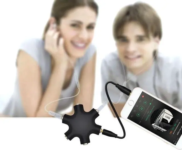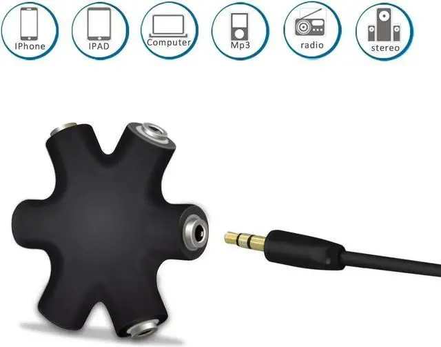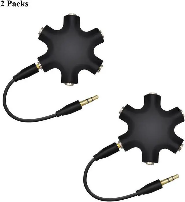 2 pcs 3.5mm headphone adapter splits line into five 3.5mm ports. Connect up to five headphones to one device for sharing music with friends