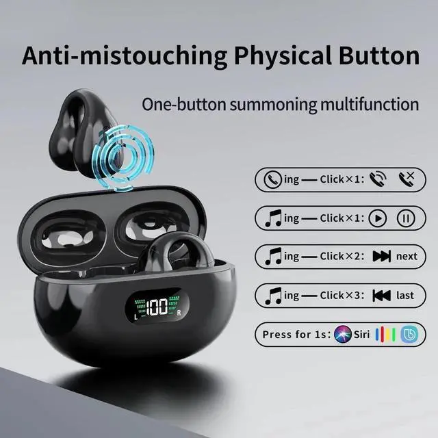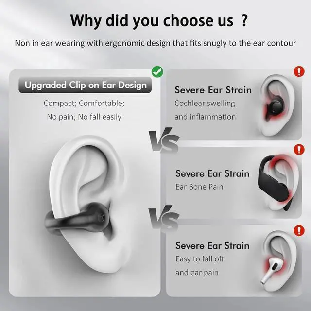 Compared with traditional Bluetooth headphones, the unique clip-on structure & bone conduction design of ear clip-on headphones is easier to wear and will not cause ear discomfort or even inflammation even if worn for a long time. At the same time, the new wearing method will not affect your wearing of glasses, nor will it fall off as easily as in-ear headphones.
