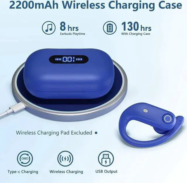 Large Capacity Wireless Charging Case with LED Display. Each earbud can get 8H playback from a full charge. 2200mAh charging case gives up to 130H continuous music time. And the charging case can support usb c fast charging, and also be compatible with wireless charger.