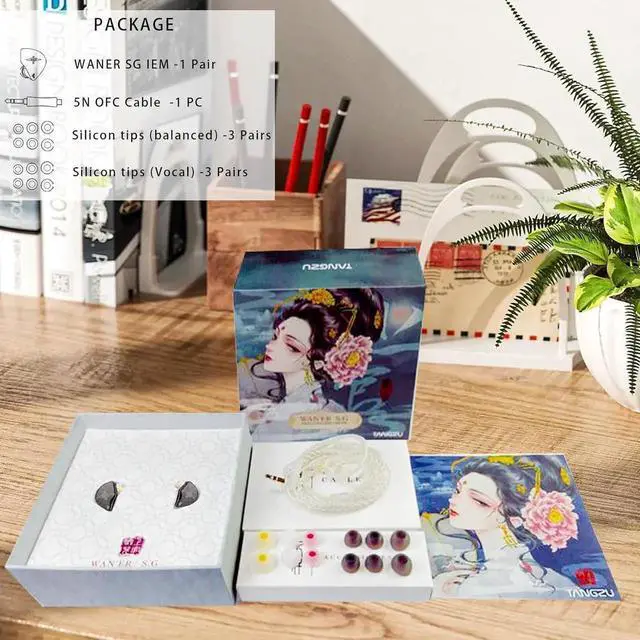 What's included:1 Pair of Earphones,1 Oxygen-Free Copper Plated Silver Wire,3 Pairs of Balanced Silicone Ear Tips,3 Pairs of Bass Silicone Ear Tips,1 Classical Chinese Style Handkerchief