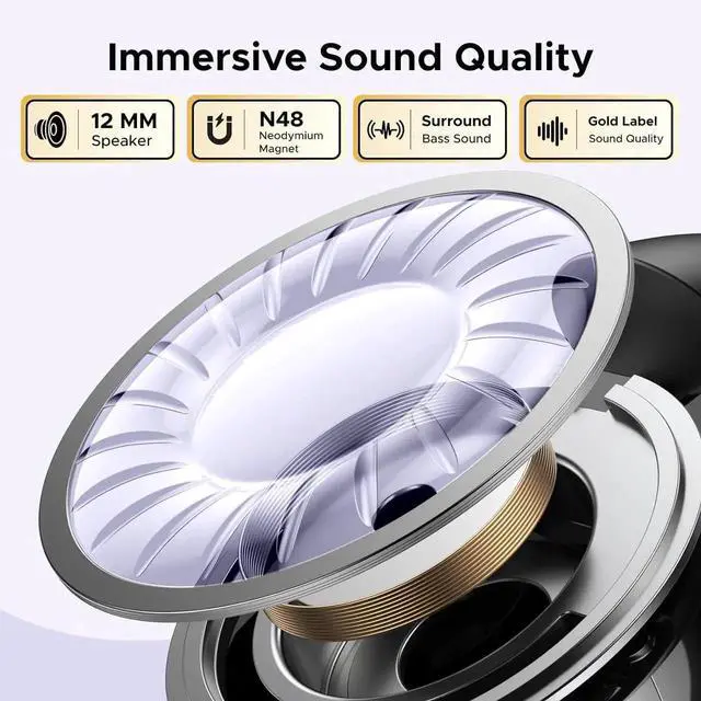 Surround Stereo Sound: Bluetooth headphones with 12mm speakers and composite diaphragms deliver powerful bass and clear mids. These headphones are designed for sound and music lovers. It can support dual-device connection mode and achieve seamless switching between two devices. Each earbud has a built-in microphone for phone calls. ENC noise reduction can make others hear your voice very clearly.