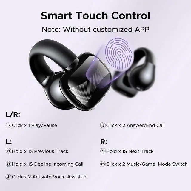 Smart Touch: The Open-Ear noise-cancelling headphones support dual-ear touch control, providing convenient operation on volume control, previous/next song, pausing and answering calls, voice assistant control, as well as switching game mode.