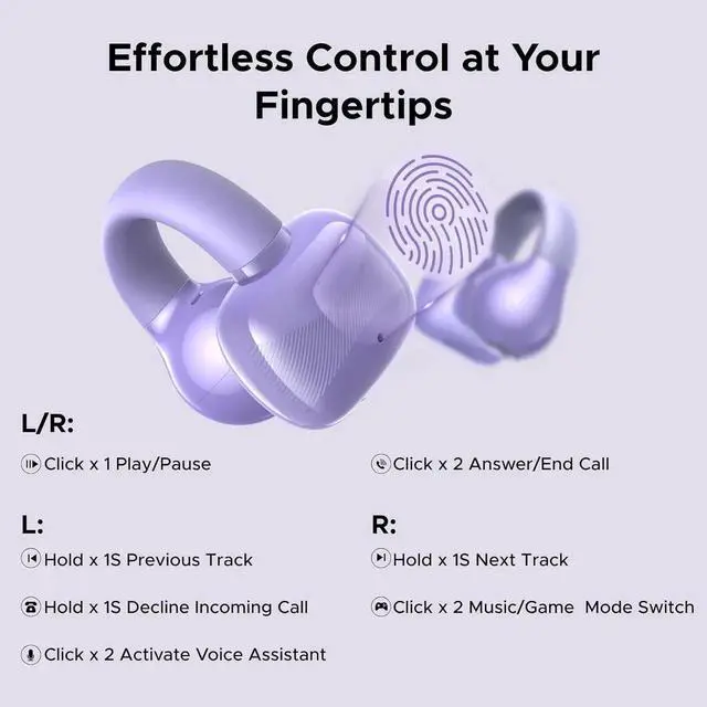 Smart Touch: The Open-Ear noise-cancelling headphones support dual-ear touch control, providing convenient operation on volume control, previous/next song, pausing and answering calls, voice assistant control, as well as switching game mode.