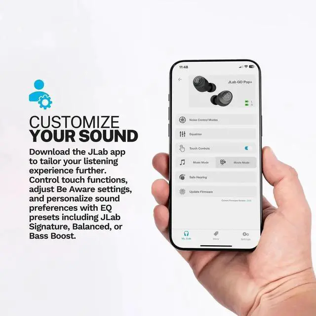 • Customizable Sound: Use the JLab app to control touch functions, adjust Be Aware settings, and personalize sound with EQ presets.