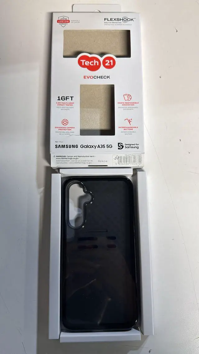 The Tech21 EvoCheck FlexShock case for the Samsung Galaxy A35 5G in black is a slim and durable protective phone case designed to provide advanced impact protection while maintaining a lightweight profile. It features Tech21s proprietary FlexShock material that absorbs and disperses shock from drops and impacts, offering up to 16-ft (4.9 m) multi-drop protection that has been independently tested. The case includes a distinctive check pattern that helps strengthen the structure and improve shock absorption, while raised edges around the screen and camera help protect against scratches and surface contact. Its flexible TPU-based construction allows easy installation and removal, and the textured finish provides a secure, non-slip grip. The case is also compatible with wireless charging and designed with precise cutouts for buttons, ports, and speakers, ensuring full access to all phone functions while keeping the device protected during everyday use