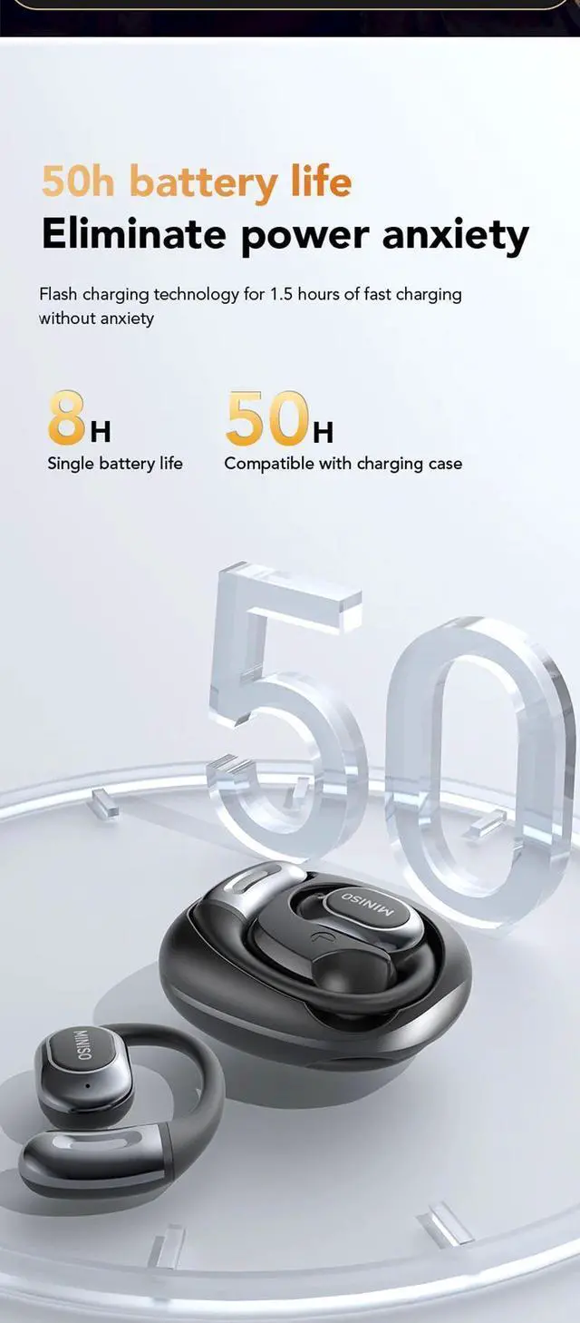 -------Product Specifications------Product Model: MINISO MS156Charging port: Type-COperation mode: touch controlCommunication distance: 10 metersBattery capacity:300mAhCall duration: About 4H(80% volume)Bluetooth version: V5.4Waterproof:IPX4Music time: About 4.5H(80% volume) Including acharging case for approximately 25HPlease download the "Saymi" APP to use AI translation and other functions.