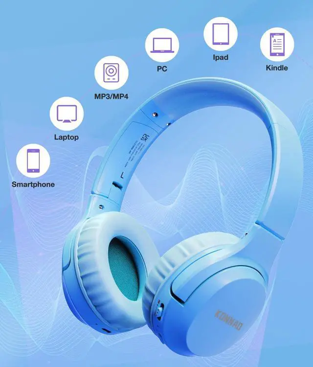 KONNAO Kids Headphones Wireless 60H, Foldable On Ear Headphone with MIC, Volume Limiter 85dB/94dB Wireless & Wired Headphones, Over-Ear Headphone for Kid Adult School Online Class Travel, Blue