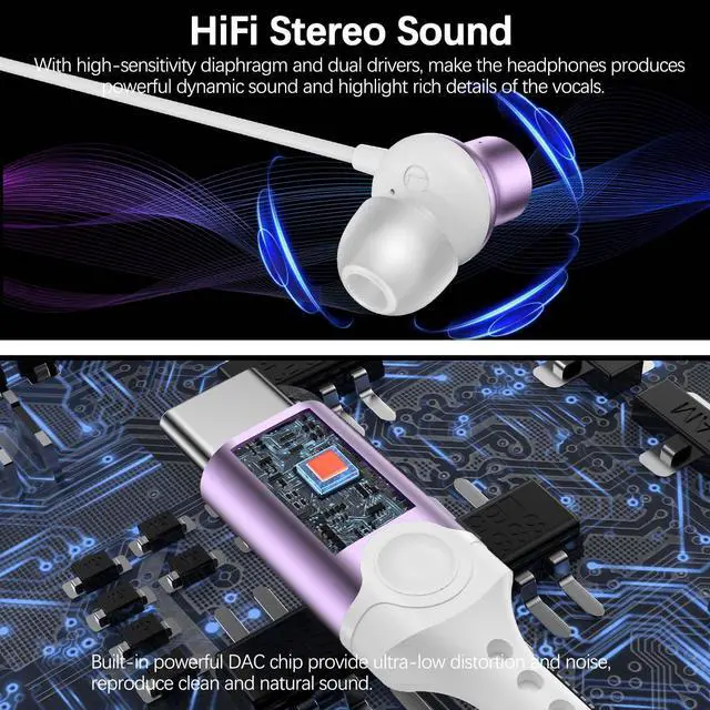 DAC Digital Type C Earbuds: Our Type C Wired Earbuds adopt updated TPE material and enhanced joint durability, 120cm/3.9ft long wired earphones good for daily use. Built with Hi-Res & DAC digital decoder chip reduce the loss in the sound transfer. Which will allow you to have clearer phone calls, enjoy HiFi stereo, excellent quality music streaming and gaming experience