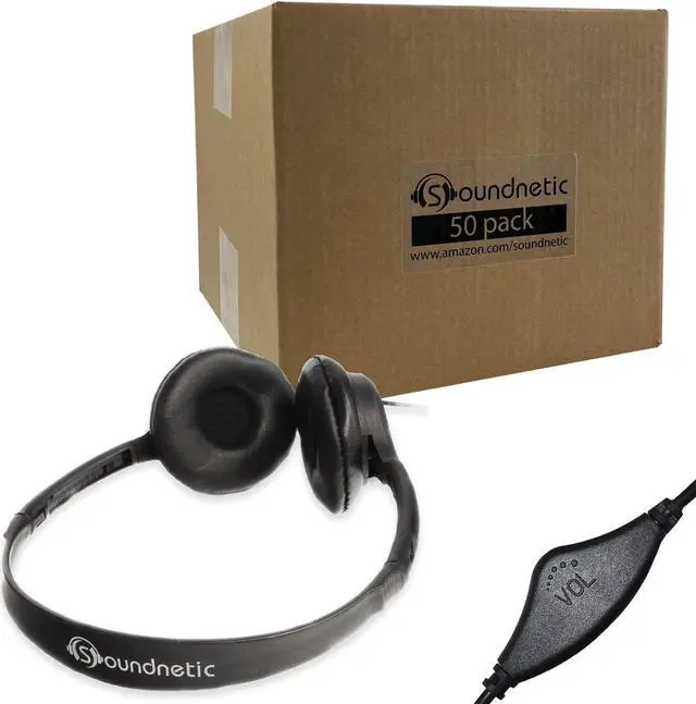 Soundnetic SNCCV Bulk Classroom Headphones 50 Pack - Stereo Headphones with Leatherette Earpads & Volume Control, Black - Ideal for Schools