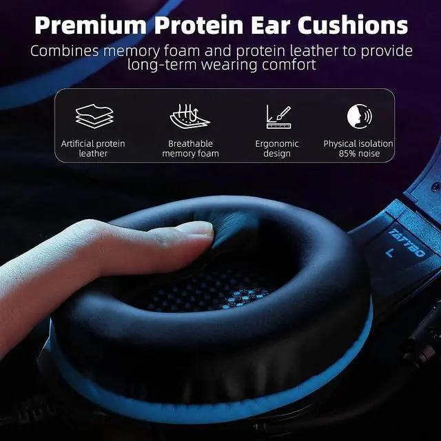 This gaming headset have high-density audio driver carries higher definition and stronger frequency sound, the resonant bass provides an all-round listening experience, and the stereo surround shows the game sound effect, and you feel that you are the protagonist of the game! Protein leather memory foam, enlarged ear cups to fully wrap your ears, padded and retractable headband to fit your head perfectly, during long gaming sessions Also feel comfortable and more immersed in the game. Leading noise-reducing tech promises crystal-clear communication with your teammates. This gaming headset with mic effectively suppresses background noise and elevates your voice. Tatybo gaming headsets aim to made for all-platform audio-visual entertainment.