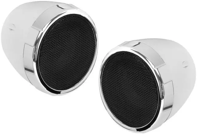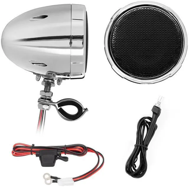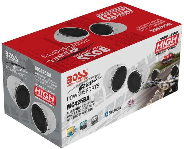 DIXSG Audio Systems MC425BA Motorcycle Bluetooth Speakers - 3 Inch, Weatherproof, Volume Control, Built-in Amplifier, ATV UTV Compatible Max out your playlists while you ride the roads or the trails with the Boss Audio MC425BA Chrome Weatherproof Motorcycle Sound System. Power up your music on your 12V Motorcycle, Scooter or ATV with the 600 Watt Max Power Amp and a pair of 3" Full Range Speakers. Hook your Smartphone or MP3 Player up to the Auxiliary Input. Bluetooth Audio Streaming lets you play your favorite music apps like Spotify and Pandora. Turn up the sound with the Wired Remote Volume Control. The MC425BA features Weatherproof Speakers to provide protection against the elements. For high quality sound on the go, fire up the Boss Audio MC425BA. Motorcycle Speaker and Amplifier Sound System - Bluetooth, Weatherproof, 3 Inch Speakers, Volume Control, Built-in Amplifier Rev up your playlists with the BOSS Audio Systems MC425BA weatherproof sound system. Hop on your 12V motorcycle, scooter or ATV UTV and enjoy great music with the power amplifier & two 3-inch full range speakers. Hook your smartphone or MP3 player up to the auxiliary input. Bluetooth audio streaming lets you play your favorite music apps like Pandora and Spotify. Crank up the volume with the wired remote volume control. The MC470B features weatherproof speakers to provide protection against the elements.