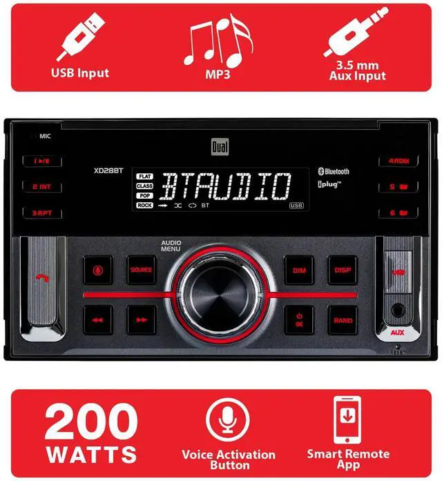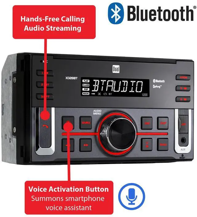 The New Dual Electronics XD28BT 7-Character LCD Double DIN Car Stereo Receiver with Bluetooth , USB , MP3 , Siri/Google Assist Button with upgraded Bluetooth Wireless Technology provides Hands Free capabilities when you need it the most. The instant and seamless pairing between your Bluetooth devices and the XD28BT car stereo allows you to immediately answer an incoming call, redial a previous call or manage your call waiting directly from the receiver. With its enhanced features you will be able to play music apps such as Pandora, Spotify, iHeartRadio, Podcasts wirelessly, listen to all your favorite tunes on your Apple, Android or Media devices and even those stored on your MP3 player. The power to harness Siri or Google assistant with the touch of a button.