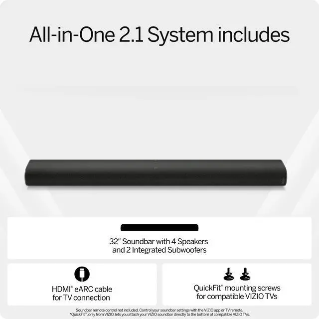 - Sound that simply fits - QuickFit eliminates the gap between this soundbar and select VIZIO TVs for a seamless setupallowing you to attach this soundbar directly to your VIZIO TV in three simple steps, no tools needed!