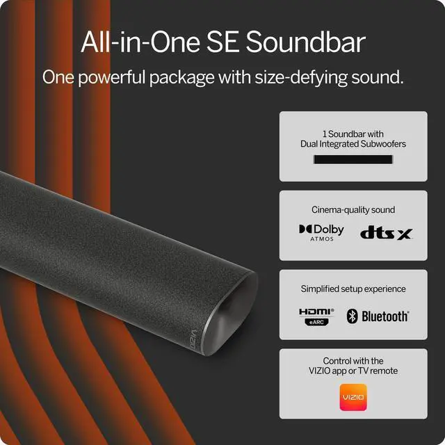 Experience sensational sound all around from 2 full-range speakers and feel the bass impact delivered by two built-in subwoofers all packaged within a streamlined compact all-in-one soundbar. Featuring Dolby Atmos immersive audio and DTS:X putting you at the center of your entertainment. Connect to your TV with the included HDMI® eARC cable, stream music, audiobooks and more with Bluetooth, and download the VIZIO mobile app for soundbar control using your smartphone.