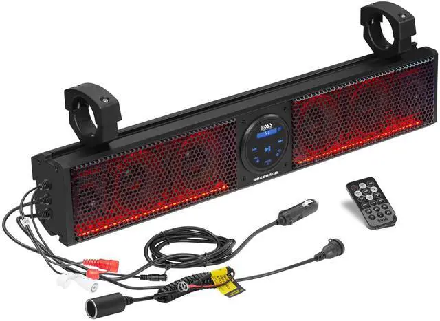 DIXSG Audio Systems SB26BRGB 26 inch ATV/UTV Bluetooth Sound Bar - 26 Inches Wide, 4 inch Speakers, 1 Inch Tweeters, IPX5 Weatherproof, Bluetooth, Built-in Amplifier, Multicolor Illumination, Golf Cart Compatible ATV UTV Sound Bar System - 26" Wide, IPX5 Rated Weatherproof, Bluetooth, Amplified, 4" Speakers, 1" Tweeters, USB, RGB Multi-color Illumination Let the call of the wild be your guide. The BOSS Audio Systems BRT26RGB IPX5 rated weatherproof 26 Soundbar provides peace of mind all weather functionality. Your ATV/UTV will be even more fun to ride now! Compatible with any 12V power source, all you need is to just plug-N-play into the included cigarette lighter power extension accessory adaptor. The built-in amplifier powers four 4 full range speakers and two soft dome tweeters. The built-in Bluetooth lets you connect to your MP3 player and smartphone audio library plus apps like Pandora and Spotify. The auxiliary output from your smartphone gives you more options to hear your music. Slap in a USB flash drive and become even more versatile! Light up the night with the RGB multi-color Illumination option