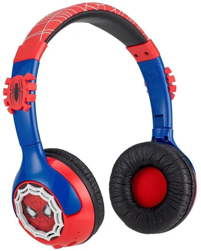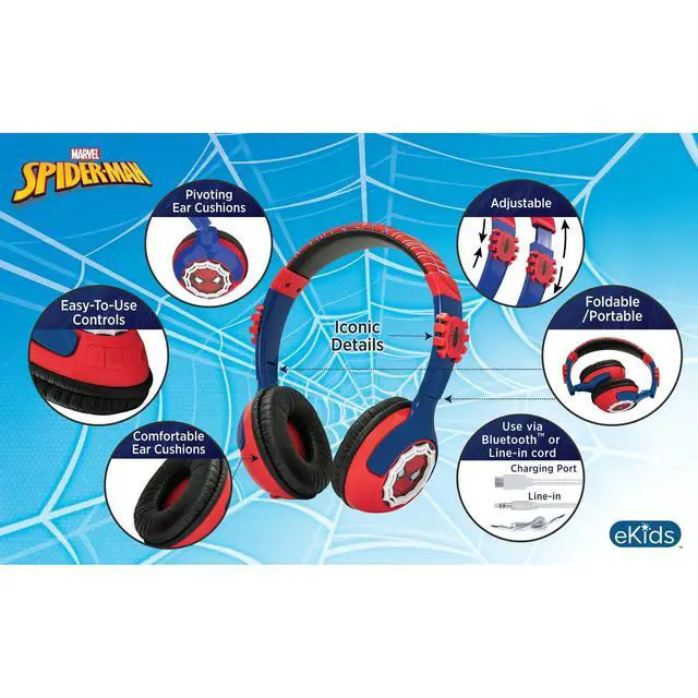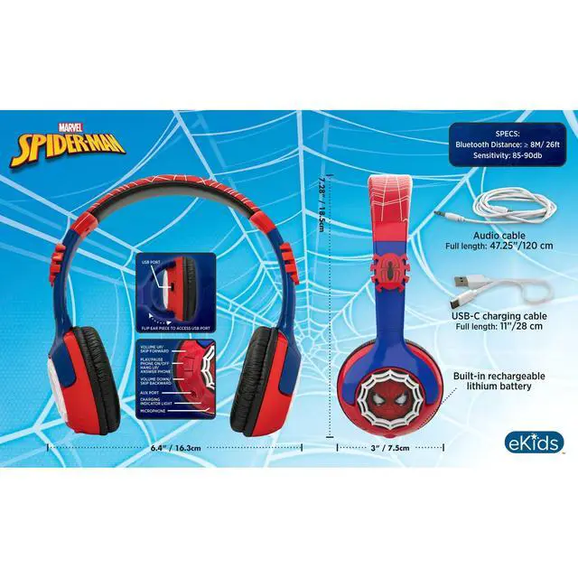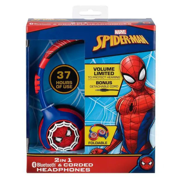 Swing into action with the over ear Spiderman Bluetooth Headphones with Cord, the perfect accessory for young superhero fans! Designed for children ages 6 and up, these headphones combine the excitement of Spiderman with high-quality sound and unbeatable comfort. With Bluetooth functionality, your child can enjoy up to 37 hours of playtime on a single charge, thanks to the built-in rechargeable battery. When Bluetooth isnt available, the bonus detachable 3.5mm audio cable ensures they can still enjoy their favorite music or movies without interruption. These headphones come with a built-in microphone, making it easy for your little one to chat with friends and family, whether theyre gaming or calling loved ones. The adjustable headband and padded ear cushions provide a comfortable, custom fit for hours of listening pleasure. Perfect for everyday use, the Spiderman Bluetooth Headphones with Cord are the ideal combination of style, performance, and comfort for every young Spiderman fan!
