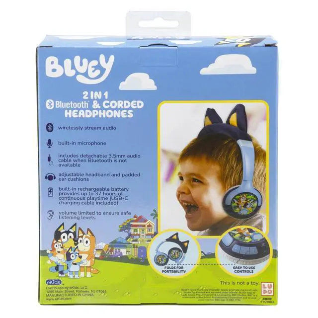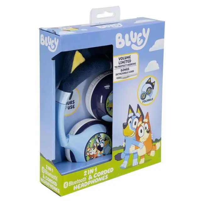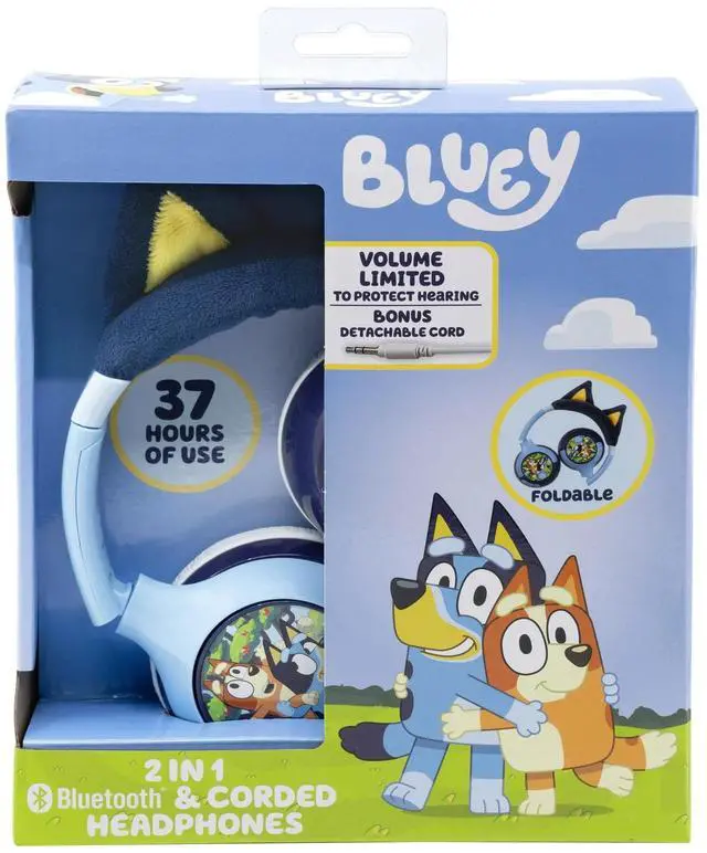 DIXSG Bluey Wireless Headphones make a great gift for any fan of the popular character! Connect to any compatible device and stream your favorite playlists and audiobooks, watch movies, TV, YouTube, and more. Use the built-in microphone while gaming or during a video call and easily switch between wireless and wired listening using the included 3.5 mm audio cable. These Bluetooth headphones are volume reduced to protect little ears, and the built-in rechargeable battery lasts for up to 37 hours between charges (USB charging cable included). Plus, the foldable design is ideal for convenient travel and storage, too. Recommended for children ages 6 and up