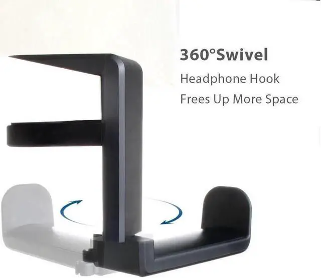 ROTATING ADJUSTABLE HEADPHONE ARM swings underneath your desk for discreet & non-intrusive storage and swings back out for easy access.