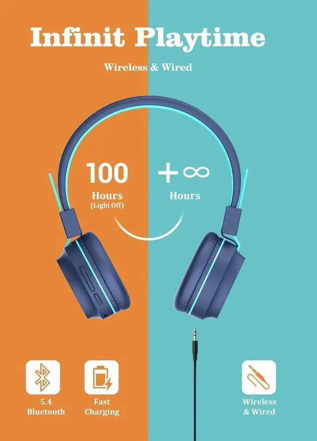 Long Battery Life: Whether you' re on a family road trip, the kids are walking to school or they are doing homework, the bluetooth headphones for kids will give you 100 hours with the lights off or 35 hours with the lights on on a single charge. Use the 3.5mm backup jack when you want to charge the kids wireless headphones and listen at the same time.