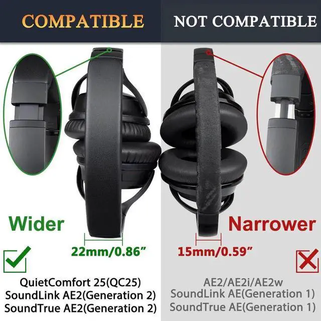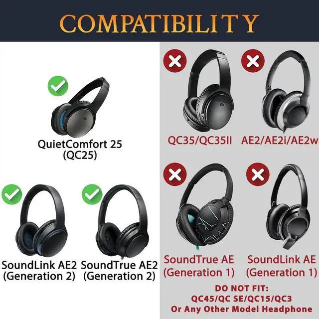 COMPATIBLE WITH: QC25/SoundLink Around-Ear II (SoundLink AE2)/SoundTrue Around-Ear II (SoundTrue AE2) Headphones only. DO NOT FIT B-ose QC15, QC2, QC35, QC45, B-ose AE1, B-ose AE2, B-ose NC700, or any other B-ose model Headphones.