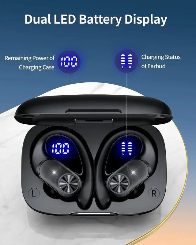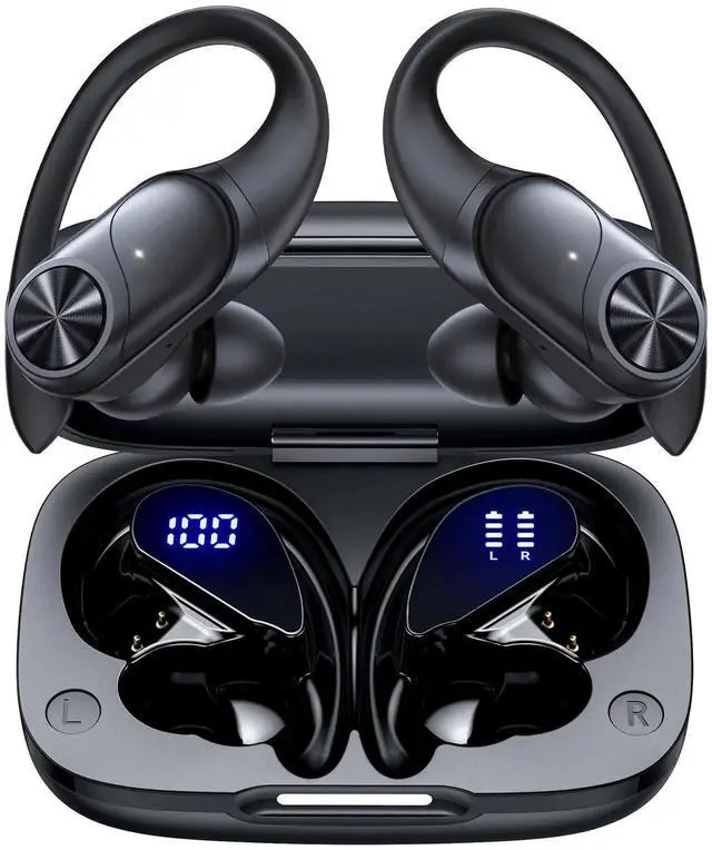 PocBuds Bluetooth Headphones Wireless Earbuds 80hrs Playtime Wireless Charging Case Digital Display Sports Ear Buds with Earhook Deep Bass IPX7 Waterproof Over-Ear Earphones for TV Phone Laptop Black