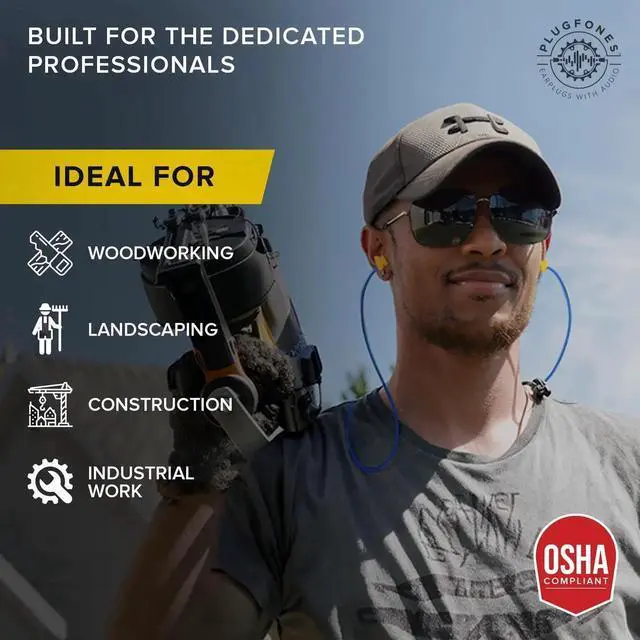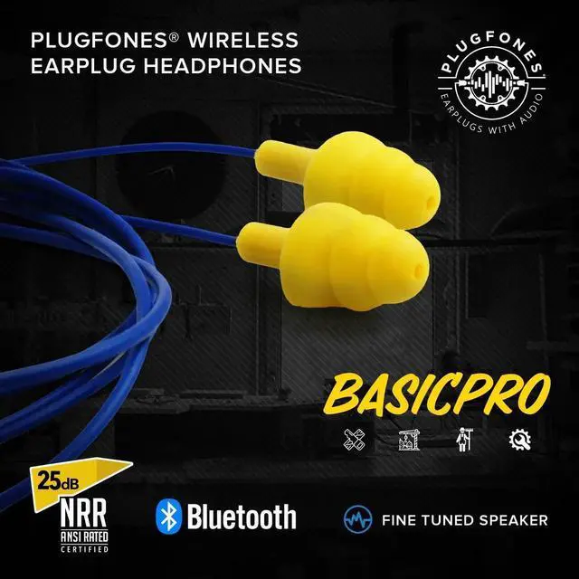 Plugfones Basic Pro Earplug Headphones Wireless Bluetooth in-Ear Earplug Earbuds 25 dB Noise Reduction Rating OSHA Compliant Hearing Protection with Noise Isolating Mic and Controls (Blue & Yellow)