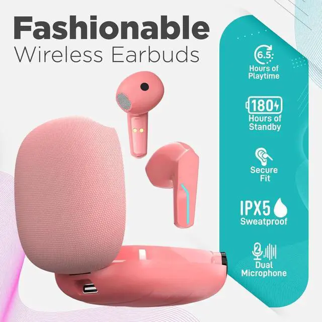 MyJoy Fashion Wireless Earbuds, Bluetooth, Long Range, Comfortable with Mic, Pink