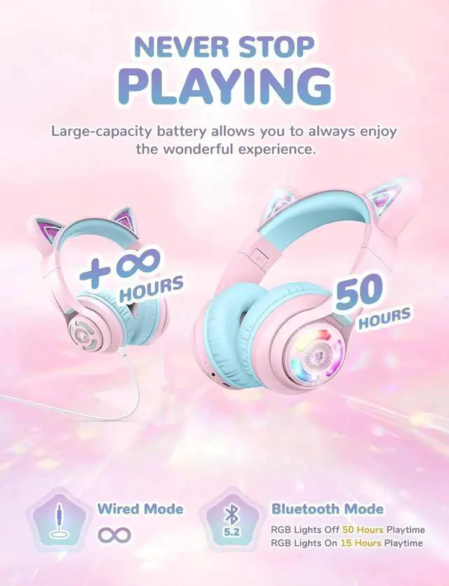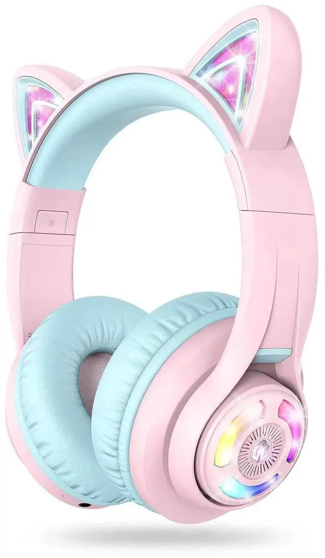 iClever Cat Ear Kids Bluetooth Headphones, LED Lights Up, 74/85dBA Safe Volume Limited, 50H Playtime, Bluetooth 5.2, USB C, Kids Headphones Wireless for Travel iPad Tablet, Meow Macaron Pink