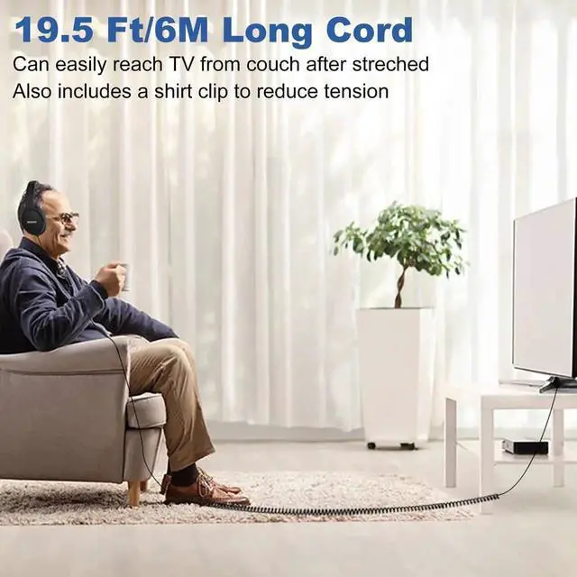 Coil Wired Extra long cord earbuds with mic and volume control, which offers 12Ft/ 3.6 m range away from TV/PC (extension cord included). No falling out and battery limit, comfortable for long time wearing.