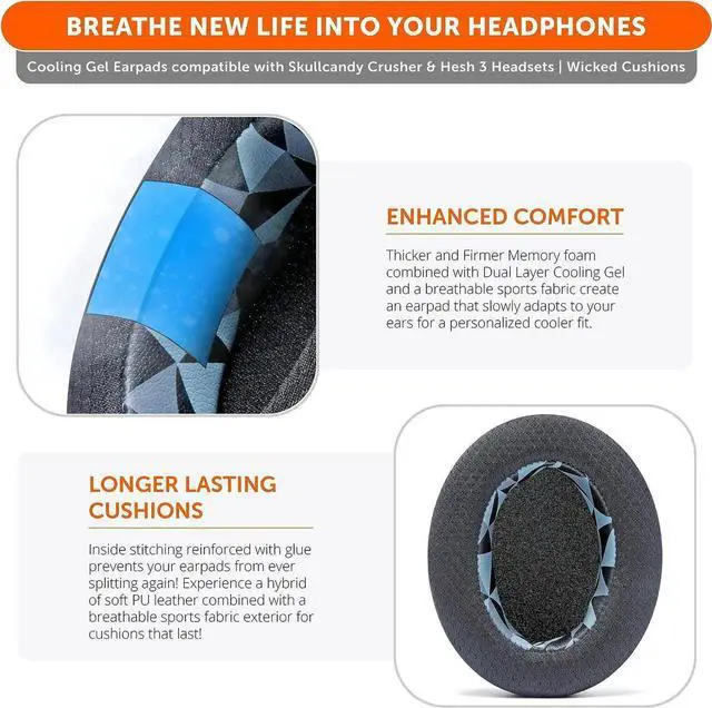 WC Freeze Crusher - Cooling Gel Earpads Compatible with Skullcandy Crusher, by Wicked Cushions - Fits Skullcandy Crusher & Hesh 3 Headphones, Soft Memory Foam, Cooler for Longer ^^ Geo Grey