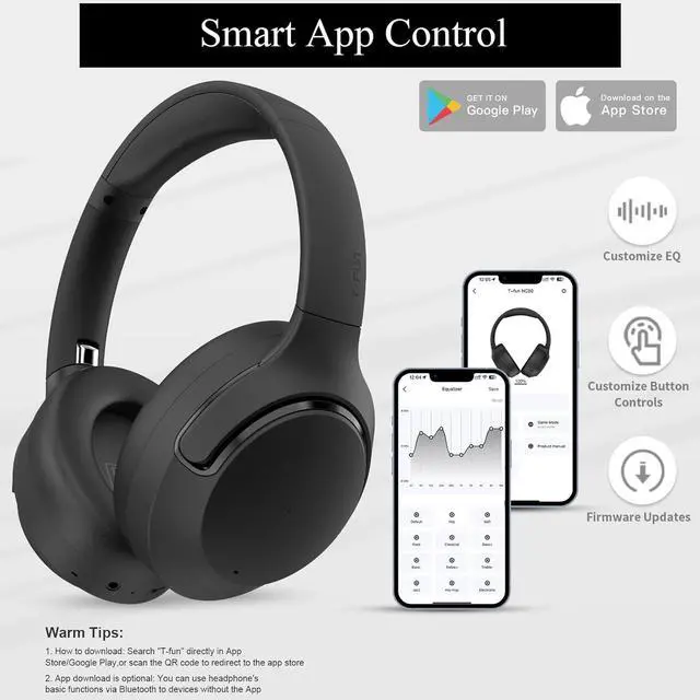Smart App Control: T-fun app' s equalizer control is like a sound playground, you can tweak it till your inner audiophile does a happy dance, or just stick to the presets. Tailor the sound to suit your mood/music preference enhances overall experience with T-fun over ear Bluetooth headphones