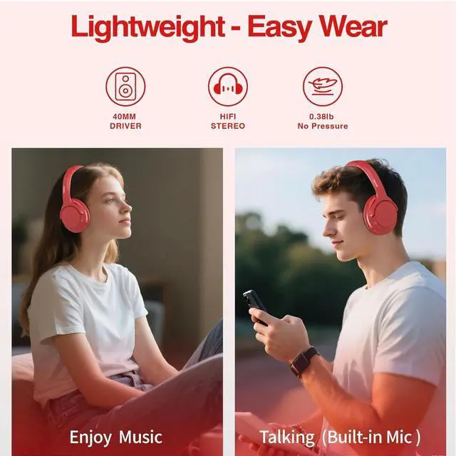 MIDOLA Bluetooth Headphones Over Ear 68H Playtime 6 EQ Wireless Headset with Microphone HiFi Stereo Foldable Lightweight Deep Bass for Travel Home Office Cellphone Red