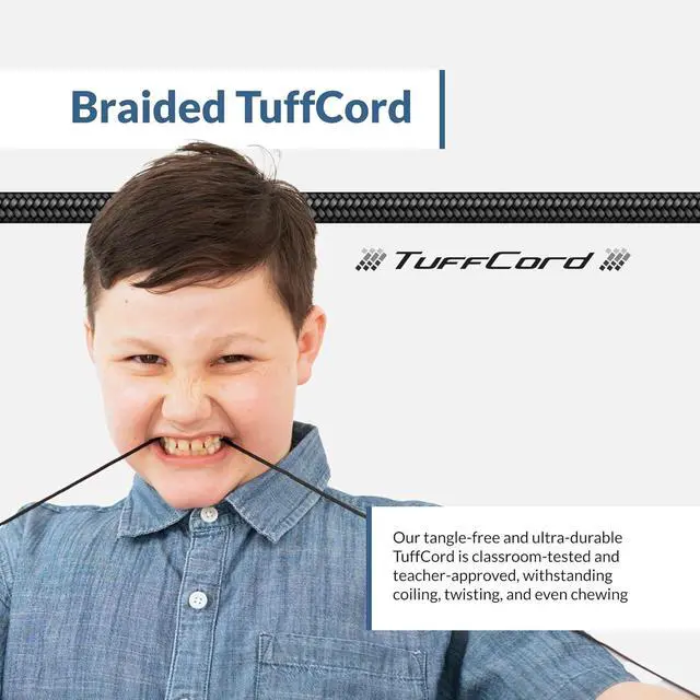 • Adjustable headband with easy to clean leatherette earpads; headband and tangle free Nylon braided TuffCord cable can be coiled or twisted or chewed without sacrificing performance