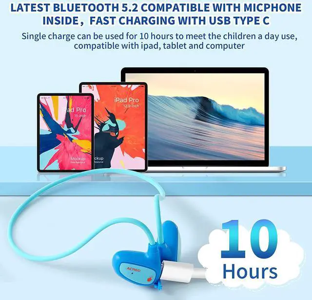 Bluetooth 5.2 Compatible & 10 Hours PlaytimeACREO OpenBuds Kids have 10 hours of single battery life, 1 hour of fast charging with type C for 10 minutes, suitable for various devices such as iPad, tablets, and PC