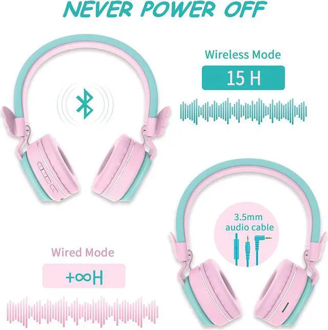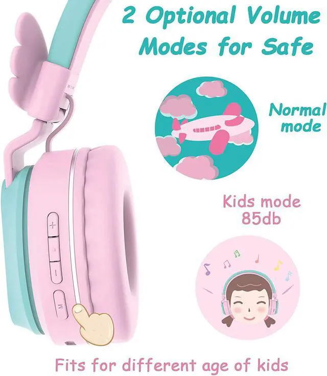 Kids Mode: BT05 kids headphones have 2 switchable Volume Limited levels for hearing protection. The headphones can be switched to normal mode and kids normal (85dB Volume Limited) by pressing the button M. The volume can be adjusted by pressing the volume button. BT05 kids headphones were specifically designed for toddlers and children. The wireless headphones bring comfortable touch feeling so that kids can safely use them in the car, on the airplane, at school and home.