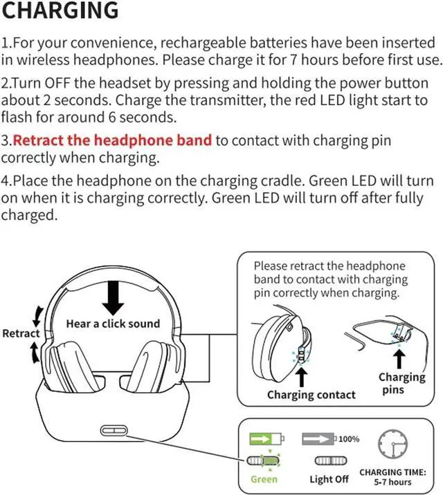 LONG PLAYTIME: The wireless tv headphones has a Unique base design, you just need to put the headphone on the transmitter / base directly(please make sure the headphone and the base are in the correct contact. ), it can charge automatically. Our wireless headphones for tv can work continuously for 20 hours after being fully charged