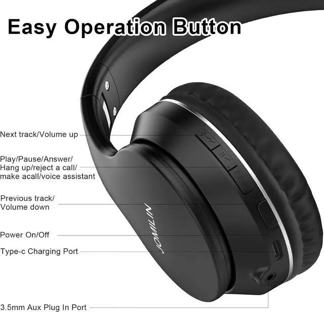 UP TO 60 HOURS PLAYTIME - JOMILIN wireless headphones deliver up to 60 hours playtime on a single charge. A quick 10-minute charge gives you up to 4 hours of playtime. This wireless headset can also easily connect to other non-Bluetooth devices via a 3.5 mm audio cable, plug in the included audio cable to listen for even longer in wired mode.