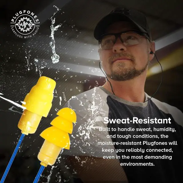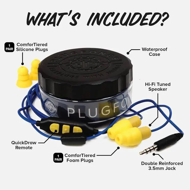 INCLUDES: Includes 1 pair each of ComforTiered Foam & Silicone plugs, waterproof case, cable clip & quick start guide. Plugfones are sweat resistant with double reinforced jack & tuned speakers.