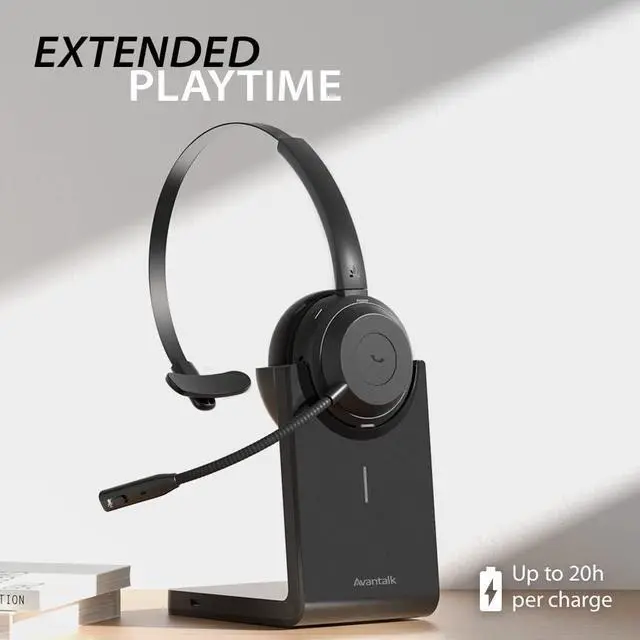 [EXTENDED PLAYTIME] The battery of the Alto Solo lasts up to 20 hours and it provides you an all-day-long usage at work. When you charge the headset, simply place it on the charging stand to recharge them within two hours.