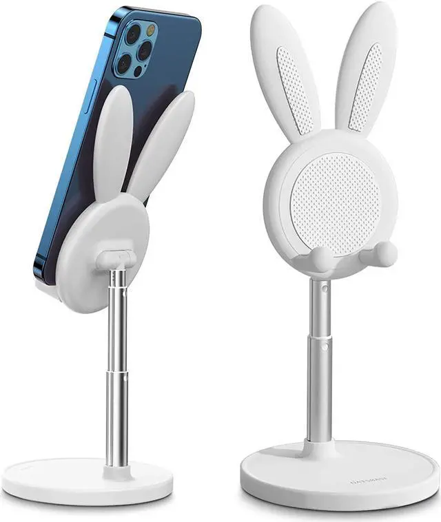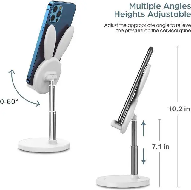 HEIGHT&ANGLE ADJUSTABLE: This bunny phone stand holder is in accordance with ergonomic design. The height can be easily adjusted between 7.1 in- 10.2 in( 3.1 in adjustable range), the angle is adjustable between 0°~60°, providing you comfortable viewing angle which helps to fix your posture and reduce neck & back strain