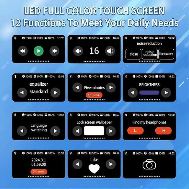 **Touchscreen Controls**: Manage music, volume, EQ settings, alarms, and locate earbuds via the full-color LCD display.