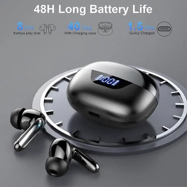 **48-Hour Battery Life**: 6-8 hours per charge plus 48 total hours with charging case featuring real-time LED power display