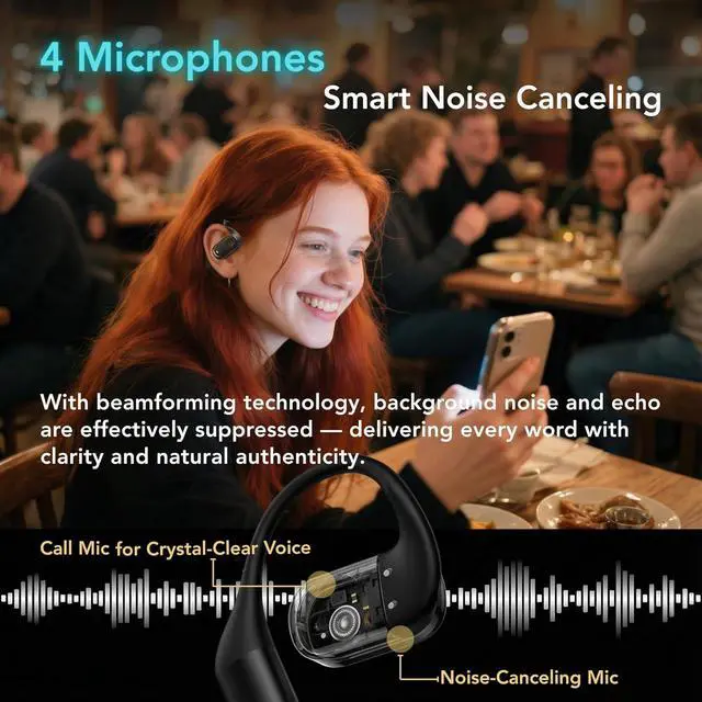 Clear Calls with 4-Mic ENC (Environmental Noise Cancellation) Four mics with AI noise reduction keep your voice crisp in traffic, offices, and outdoor workouts.