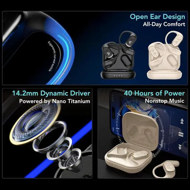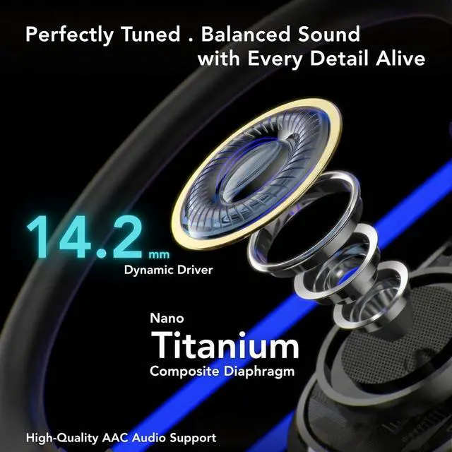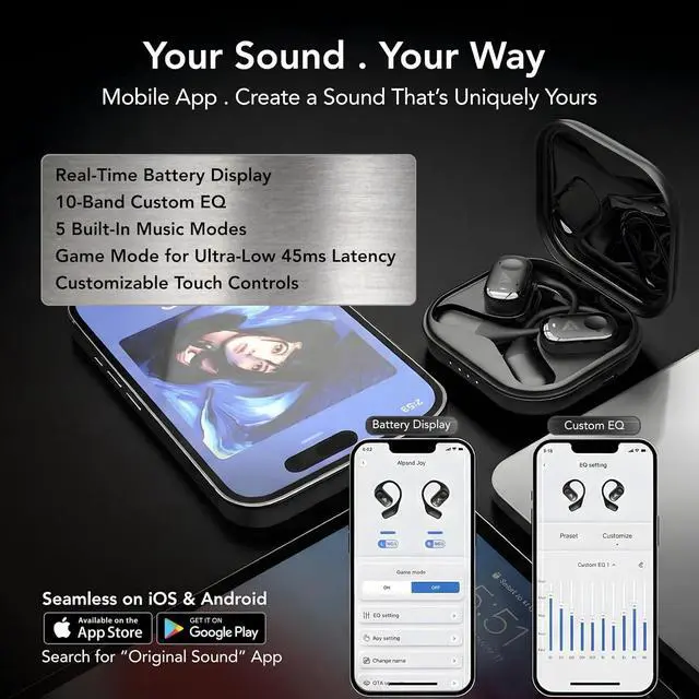 App EQ Customization + HD (High-Definition) Sound Fine-tune EQ, remap touch controls, and switch to low-latency Game Mode. 14.2 mm drivers deliver clear highs and balanced bass with natural open-ear audio.