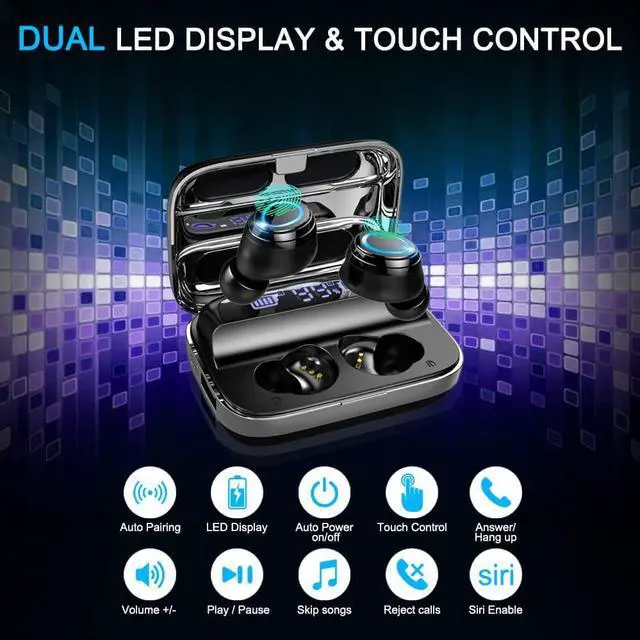 Latest Bluetooth 5.3 Technology and Dual LED Display: True wireless earbuds Bluetooth 5.3 are equipped with the most advanced Bluetooth 5.3 chip, which provides more stable connection (15m), faster paring (just need 2 seconds ) and universal compatibility. Rid of cord, enjoy true wireless. With the individual LED display on the case can help check the remaining power of the wireless bluetooth earbuds and charging case at any time.