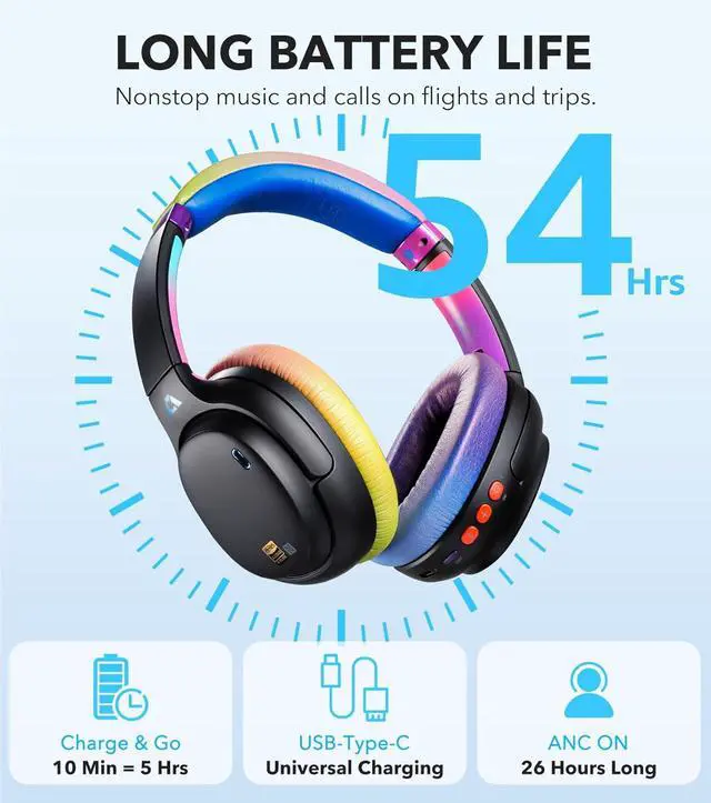 54 HOURS OF NONSTOP PLAYBACKEnjoy music and calls all day and beyond with up to 54 hours of battery life with the over-ear wireless headphones. A quick 10-minute charge gives you an extra 5 hours. Worry-free power for long flights, office workdays, or relaxing at home